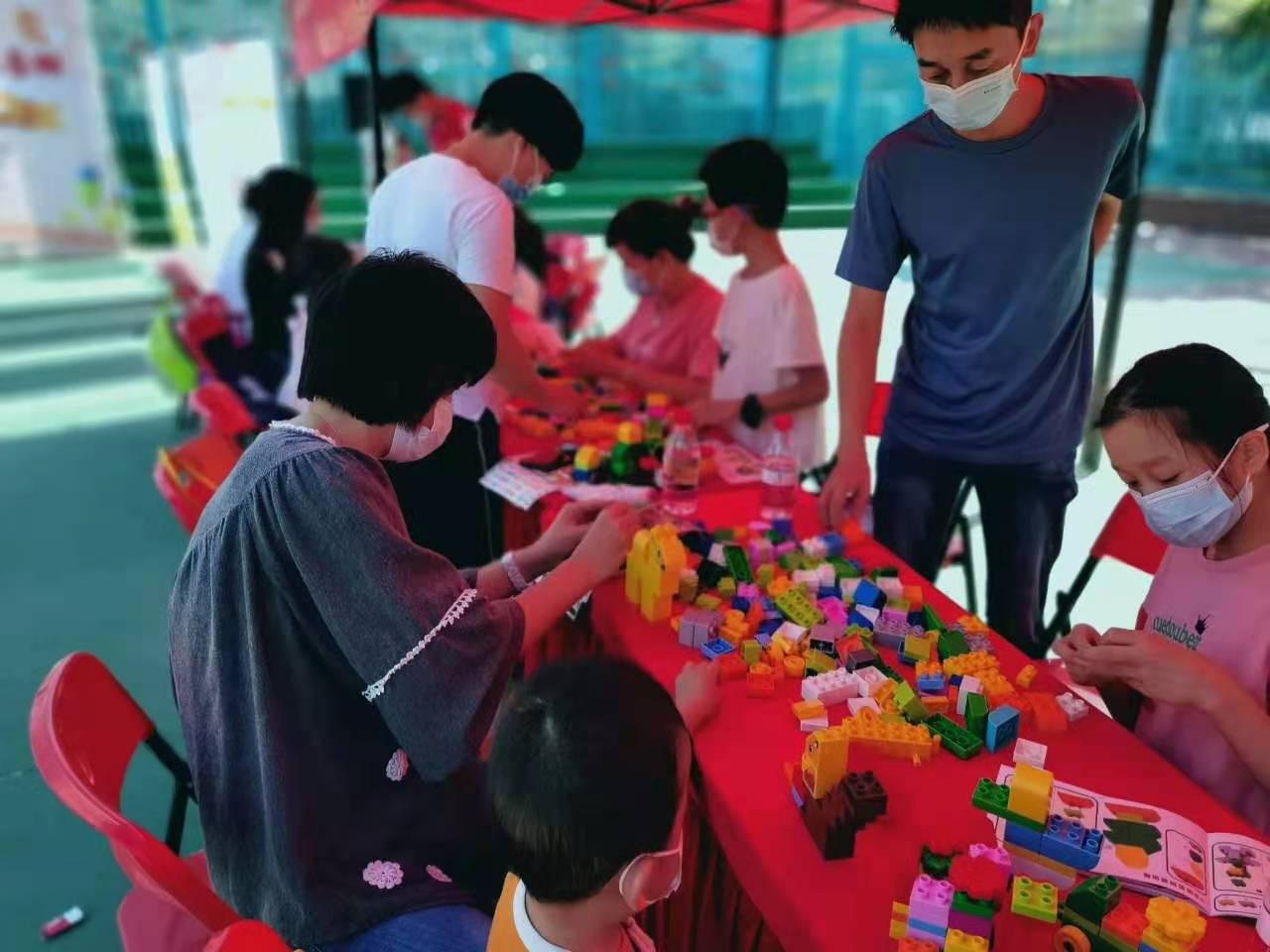 本次活動秉承寓教于樂、寓學于趣的理念以兒童“創意積木比拼大賽”的形式開展,由水思源品牌設計公司提供相關現場活動物料,如:展板、音響等設備,并在現場設立了科學育兒,科學備孕等相關知識展架,加強現場宣傳效果。本次活動做好了基礎防護工作,活動期間所有參與人員均需佩戴口罩。17戶家庭報名參與了本次活動,在工作中人員的帶領下,家長與孩子們積極有序的進行了相關知識的學習與積木比拼大賽,整場活動在歡快的學習與游戲氛圍中圓滿完成。